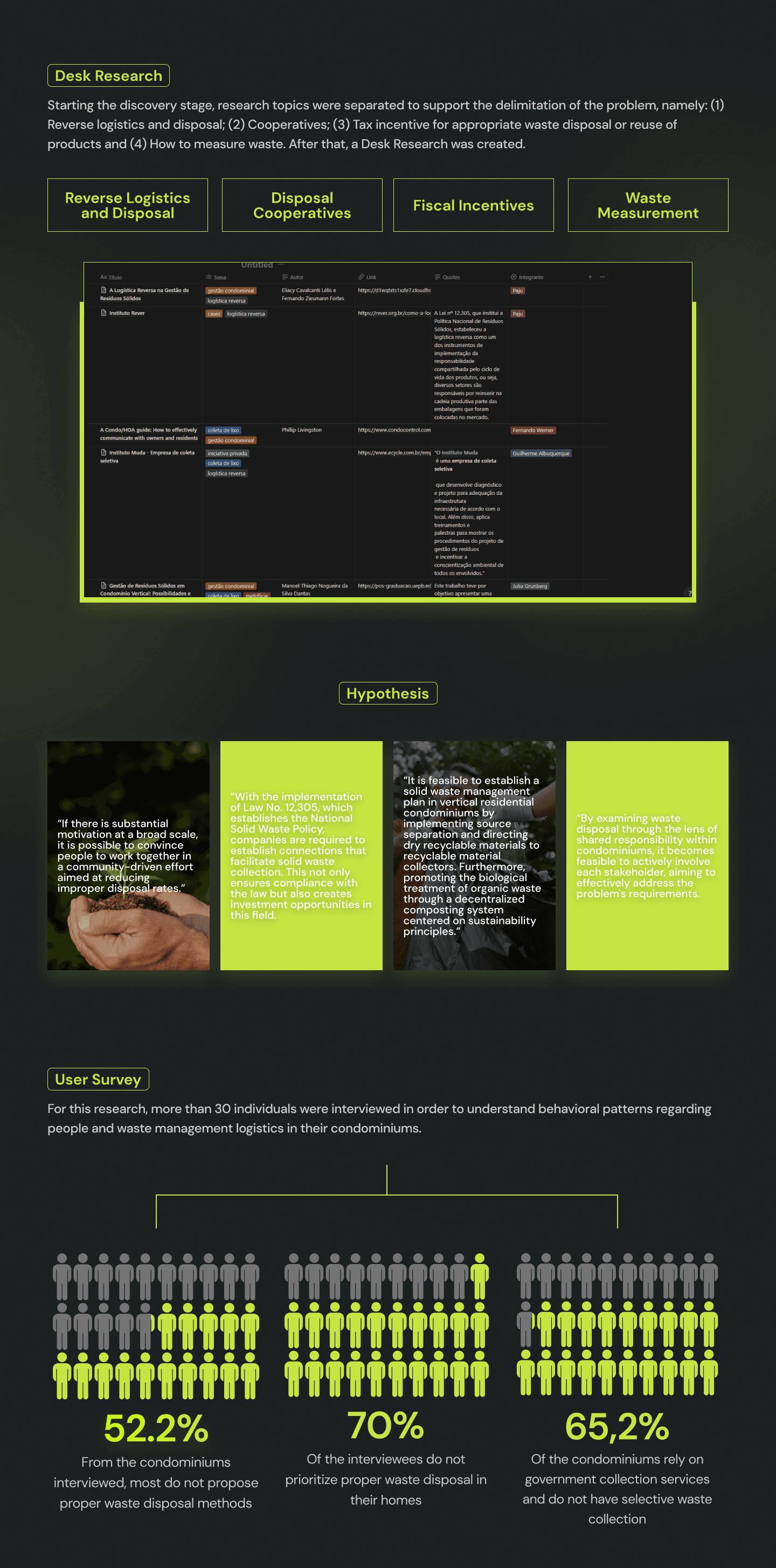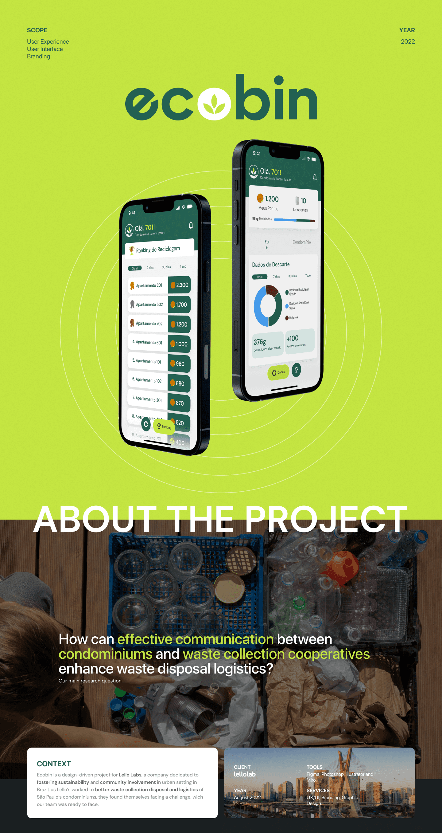 Ecobin is an academic project with the aim of understanding and creating possible solutions for the problematic scenario of logistics and waste collection in São Paulo, helping Lello, a condominium company, and its residents to measure their waste disposal and be able to contribute to logistics and improvement of the collection process as a whole.