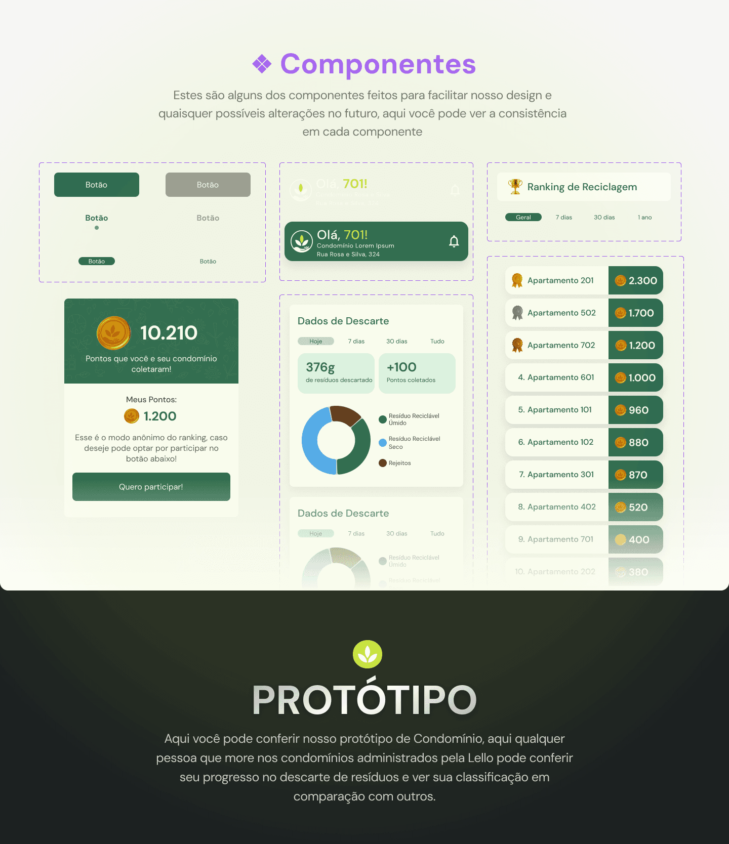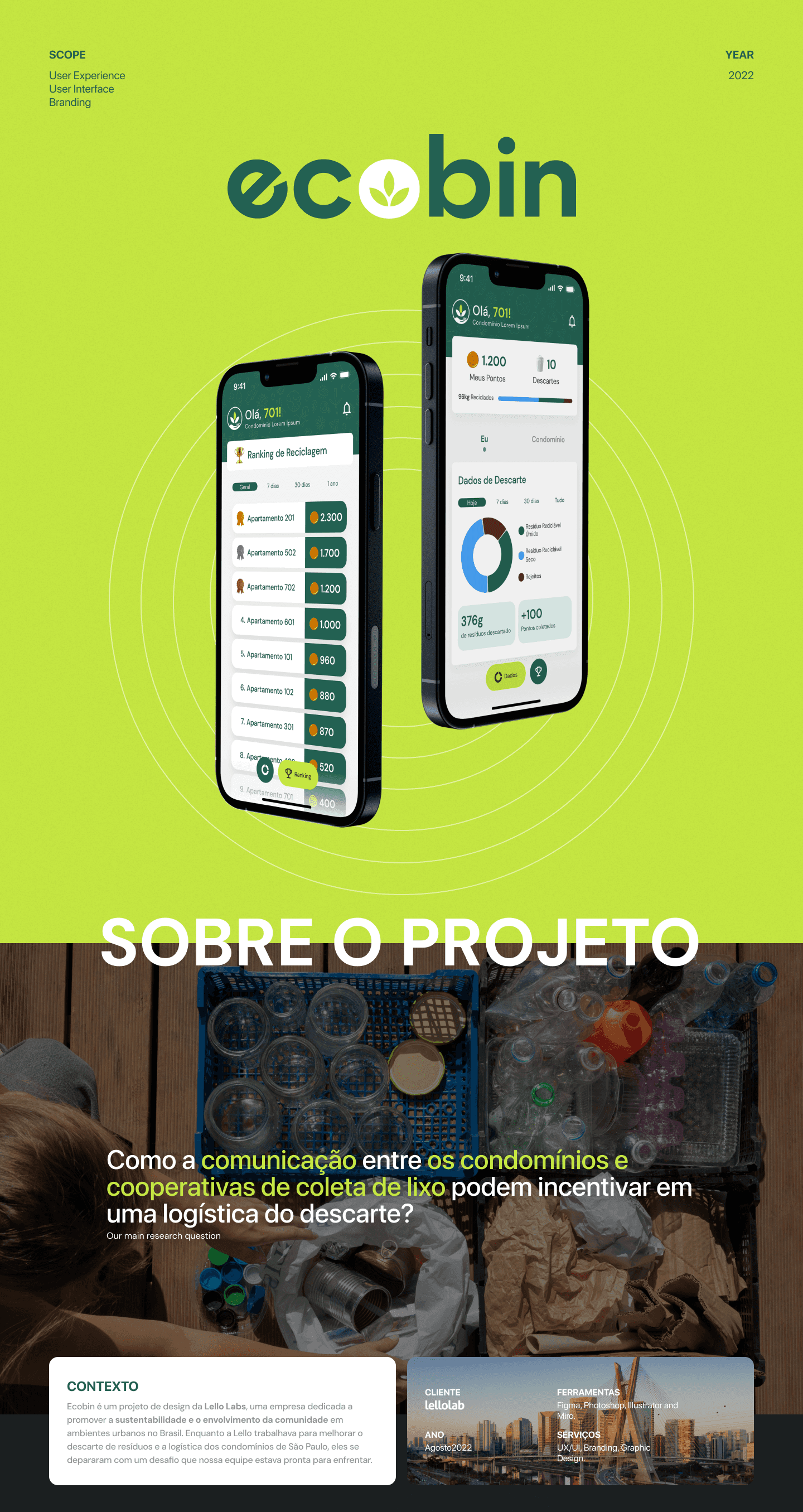 Ecobin é um projeto acadêmico com o objetivo de entender e criar possibilidades de soluções para o cenário problemático de logística e coleta de lixo em São Paulo, auxiliando a Lello, uma empresa condominial, e seus moradores a metrificar seu descarte de resíduos e poder contribuir na logística e melhoria do processo de coleta como um todo.